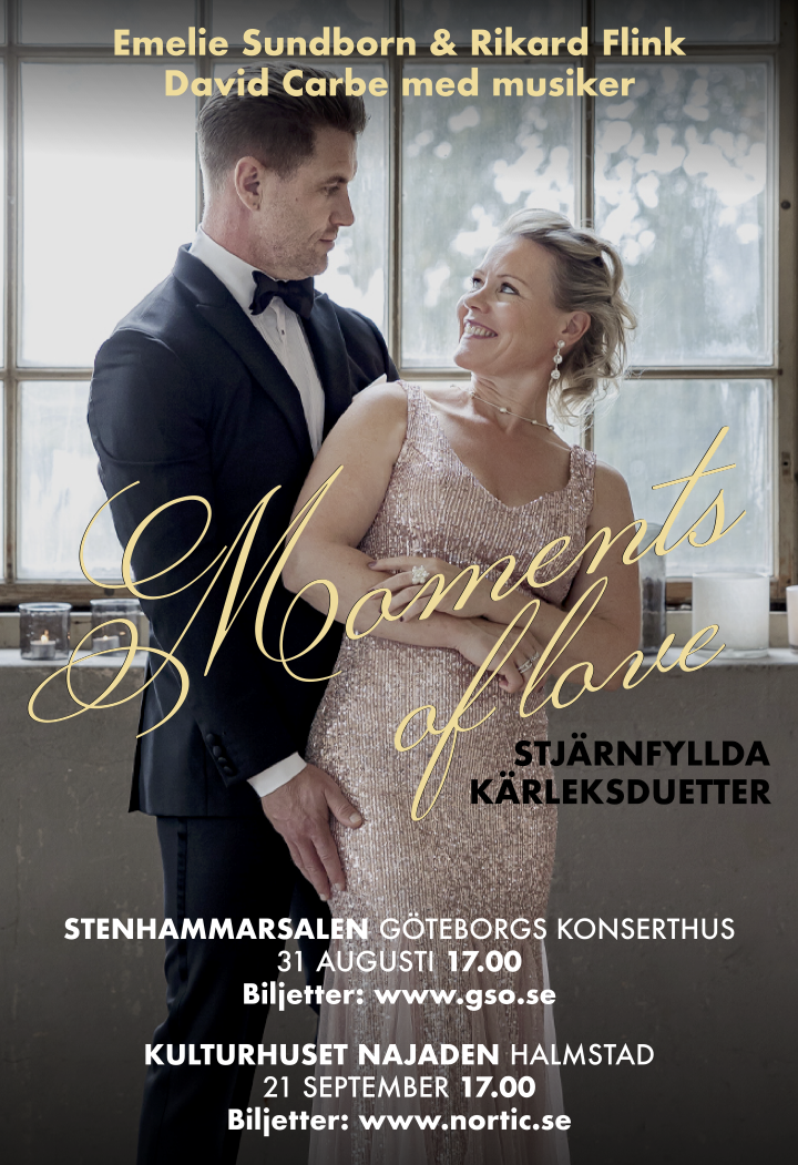 Under de senaste åren har Emelie Sundborn och Rikard Flink gjort bejublade sommarkonserter längs västkusten och i december förra året gästade de både Stenhammarsalen och Tjolöholms slott med sin julkonsert “En strålande jul”. Nu kommer de för första gången till Kulturhuset Najaden med en konsertkväll fylld av kärlek och värme där storslagna duetter blandas med egna tolkningar av sånger från de stora världsscenerna.