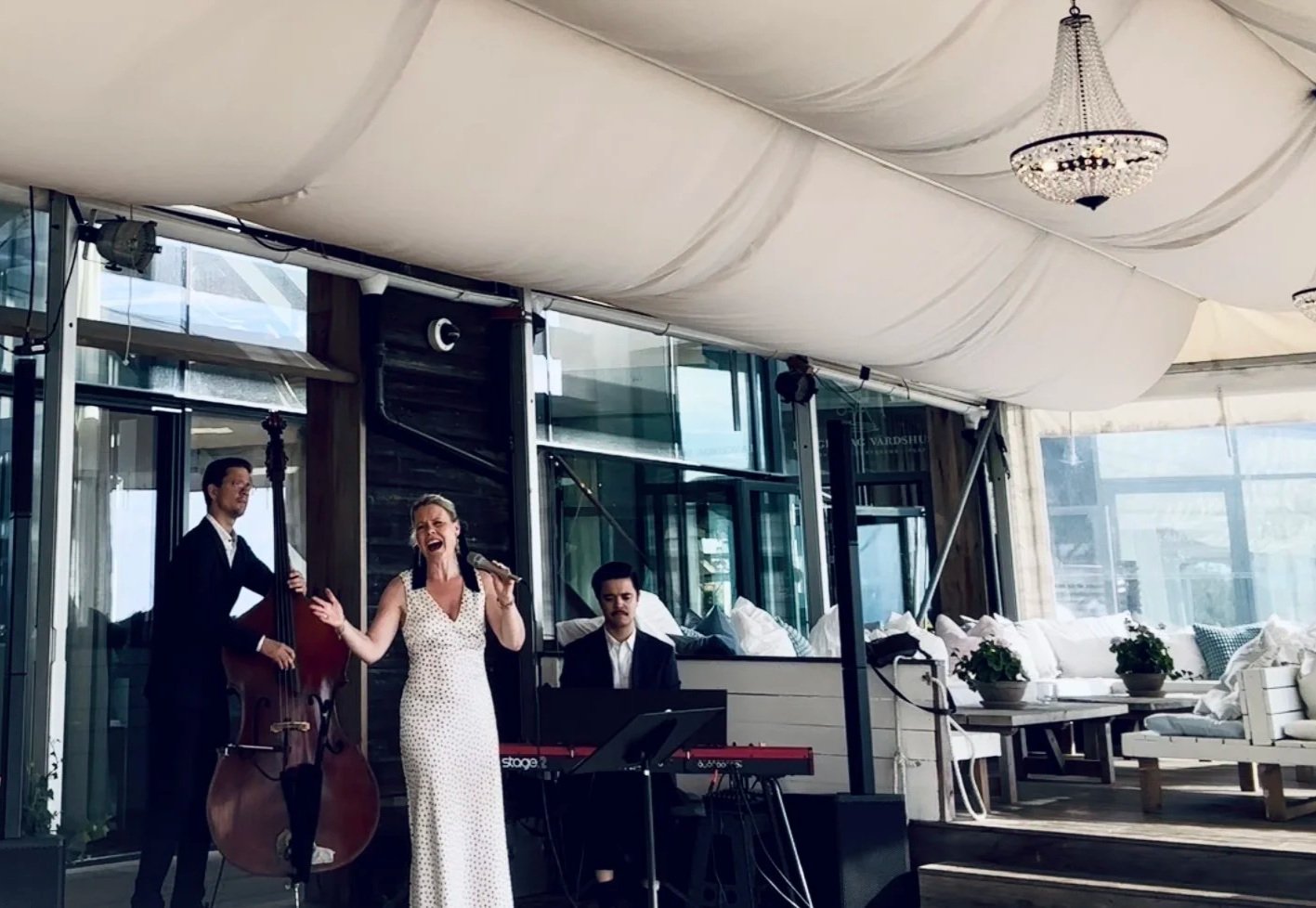 Sjunger gör jag, Emelie Sundborn. Jonas Nilsson är vår fantastiske och kreative kontrabasist. Och på piano har vi den skicklige och positive jazzmusikern Hampus Torarp. Det är en ynnest för mig att få sjunga med så härliga och grymt duktiga musiker och vi har väldigt roligt när vi spelar tillsammans vilket märks säger vår publik.